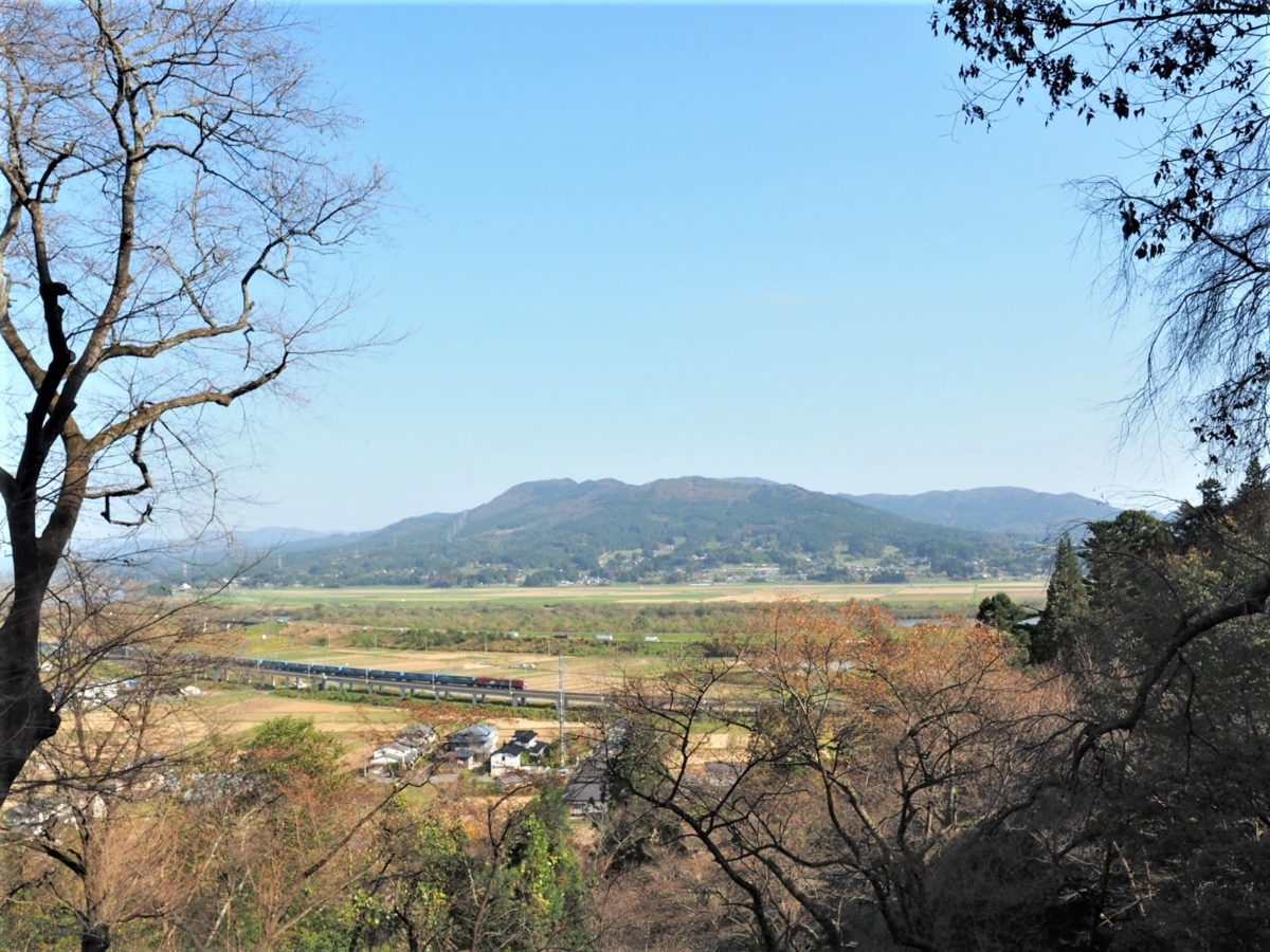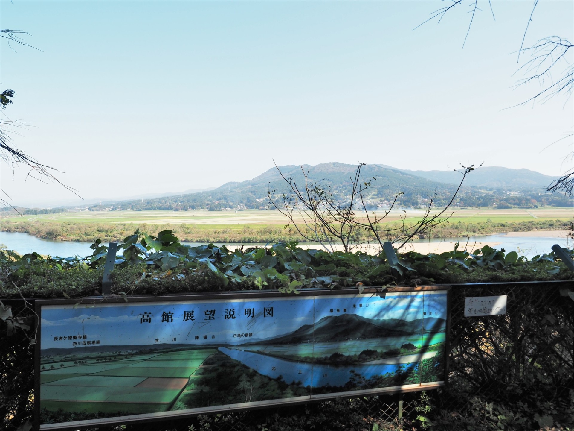 無量光院跡から北西へ350mほど行くと、「高館義経堂」への入り口となる。ちょっとした坂を上り、途中で参拝券を買ってさらに数分登ると、目の前に束稲山(たばしねやま)を背景に北上川が流れる雄大な景色が広がる。ここがかの源義経と武蔵坊弁慶の終焉の地と言われる「高館」。激しい戦いがあったはずの場所だが、とても風光明媚な場所で、そのギャップに驚く。