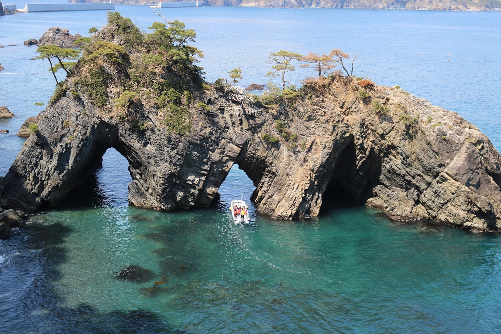 碁石海岸の奇岩「穴通磯」を間近で通過する遊覧船。荒々しい海岸美を楽しめる。お申込窓口は碁石海岸インフォメーションセンター。運行時期はワカメ養殖などがない6月~11月ごろとなります。