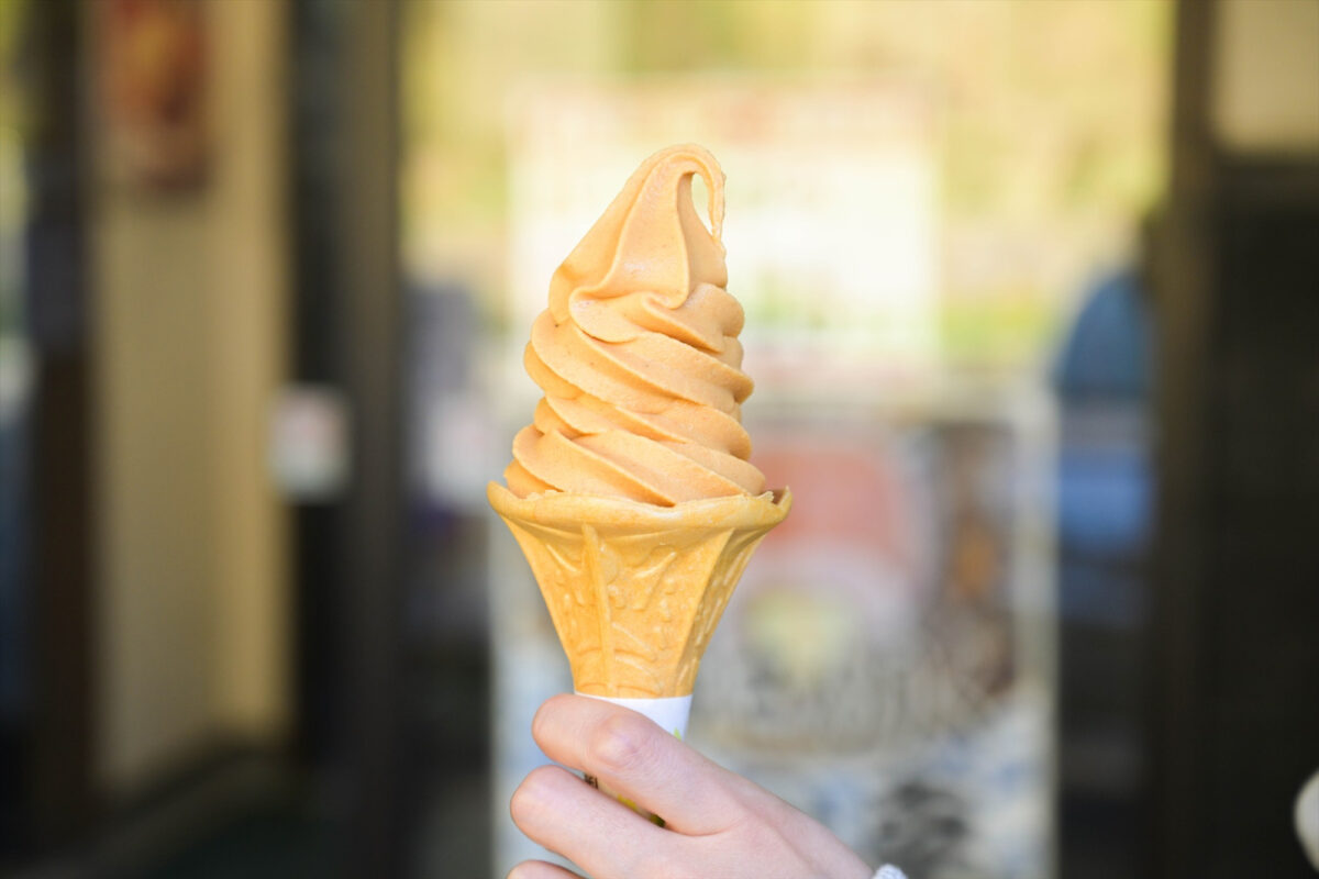 大船渡市の海産物や特産品を中心に、様々なお土産品が販売されている人気スポット「道の駅さんりく」で生まれた、特産の「こえだ柿」を使った日本で初めての柿のソフトクリーム。大きな「日本初の柿ソフトクリーム」の看板が目印。